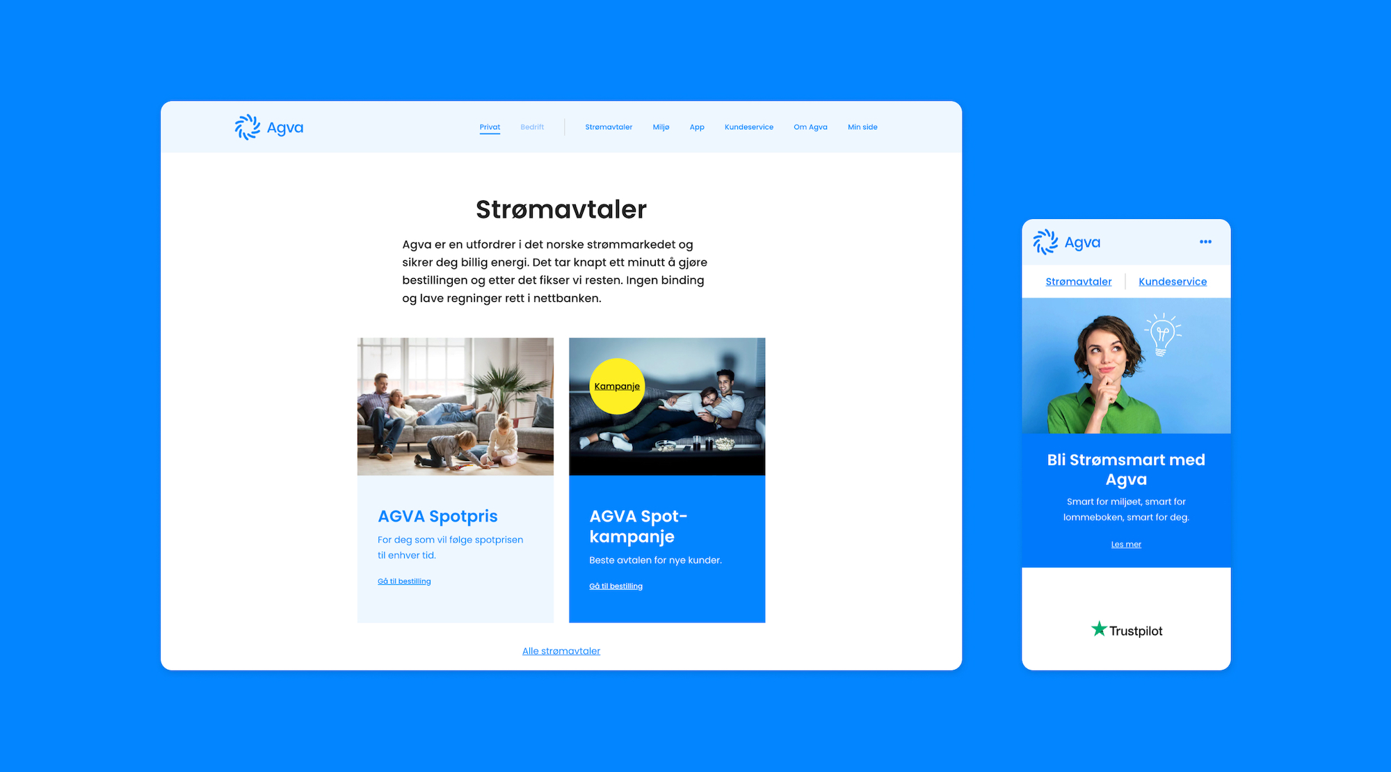 Agva Kraft er hovedsakelig en leverandør til det norske husholdningsmarkedet for strøm. De har imidlertid etter hvert også kommet inn på SMB-markedet og Maksimer har utviklet bestillingssiden Agva Bedrift med utgangspunkt i designet til deres hovedsider.